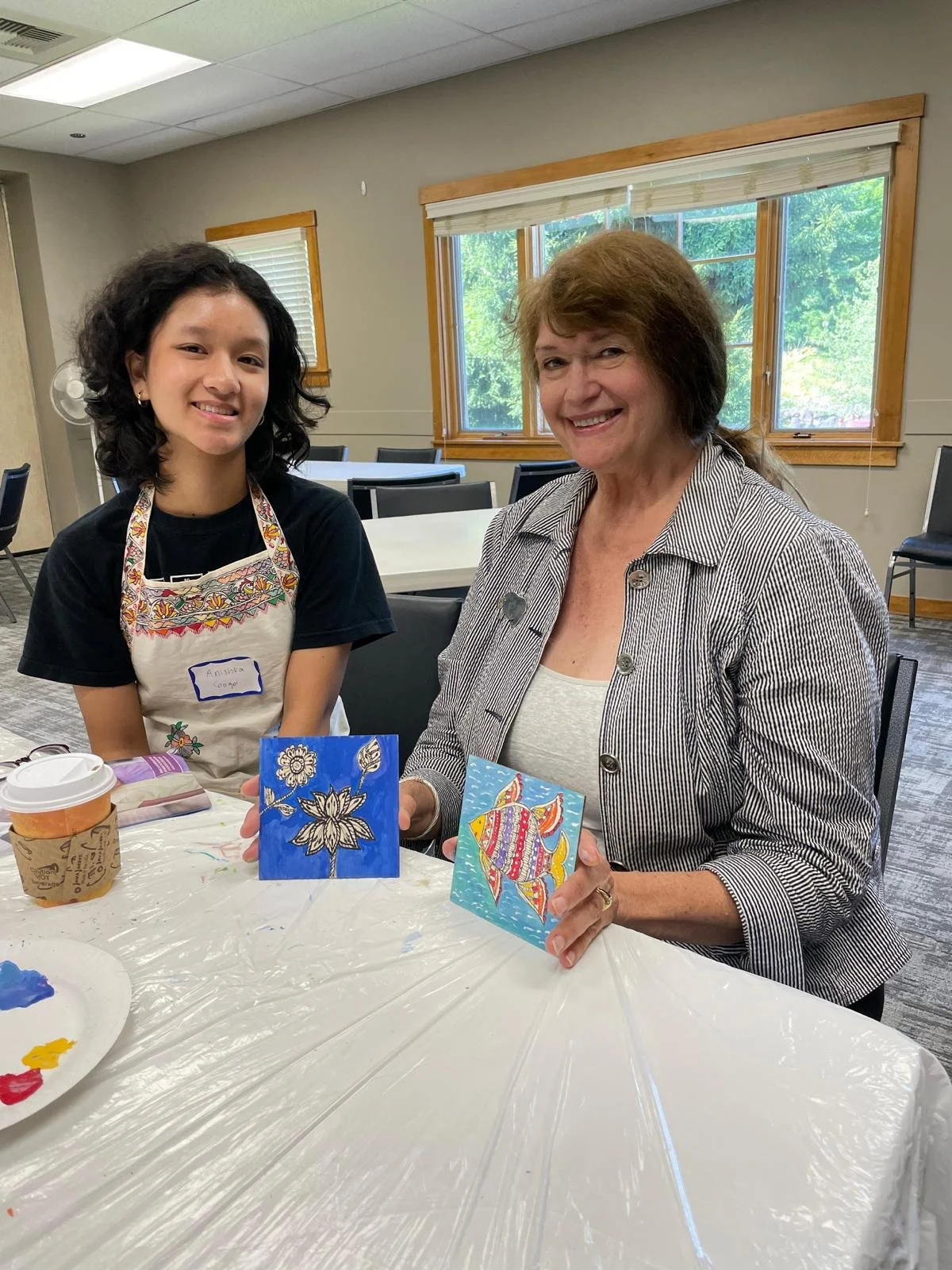 On July 20th, Deepti Designs held a free art workshop at the Northshore Senior Center, where the seniors there got to draw and paint various Madhubani designs on wooden coasters and bookmarks. Students Khushi Sherigar, Anishka Gogoi, Anvi Dua, and Aadya B volunteered to help conduct the event and were able to work one-on-one with the seniors. After the event, the seniors suggested Deepti Designs return soon for another session which was a great award for our students. One of the seniors even recognized Aadya in a social media comment for her great teaching.